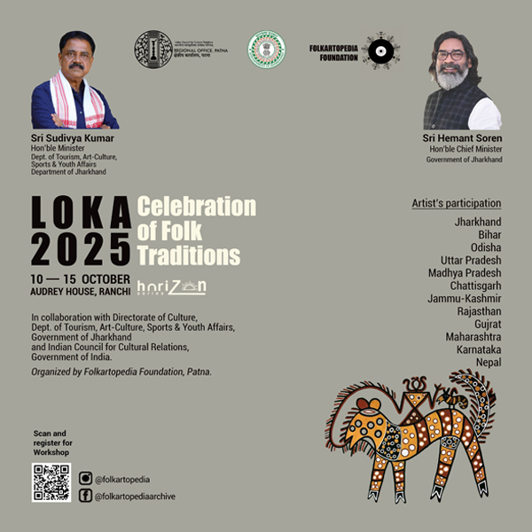 Folkartopedia Foundation, in collaboration with the Directorate of Culture, Department of Tourism, Art-Culture, Sports & Youth Affairs, Government of Jharkhand and Indian Council for Cultural Relations, Patna, Ministry of External Affairs, Government of India is pleased to announce the LOKA 2025: Celebration of Folk Traditions, the 1st National Exhibition of Folk Arts in Jharkhand. Experience mesmerising collection of Folk, Traditional and Tribal Arts from across the country.